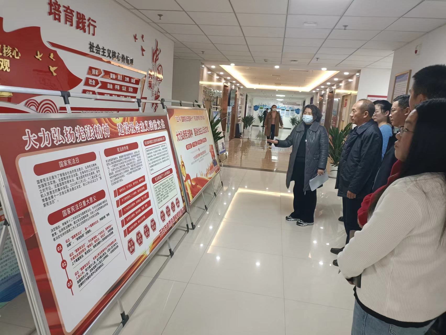 一是设置宪法宣传日主题宣传展板、海报。组织职工和来访群众进行参观学习,同时印发宪法知识宣传页,深入开展宪法精神学习和宣传活动。