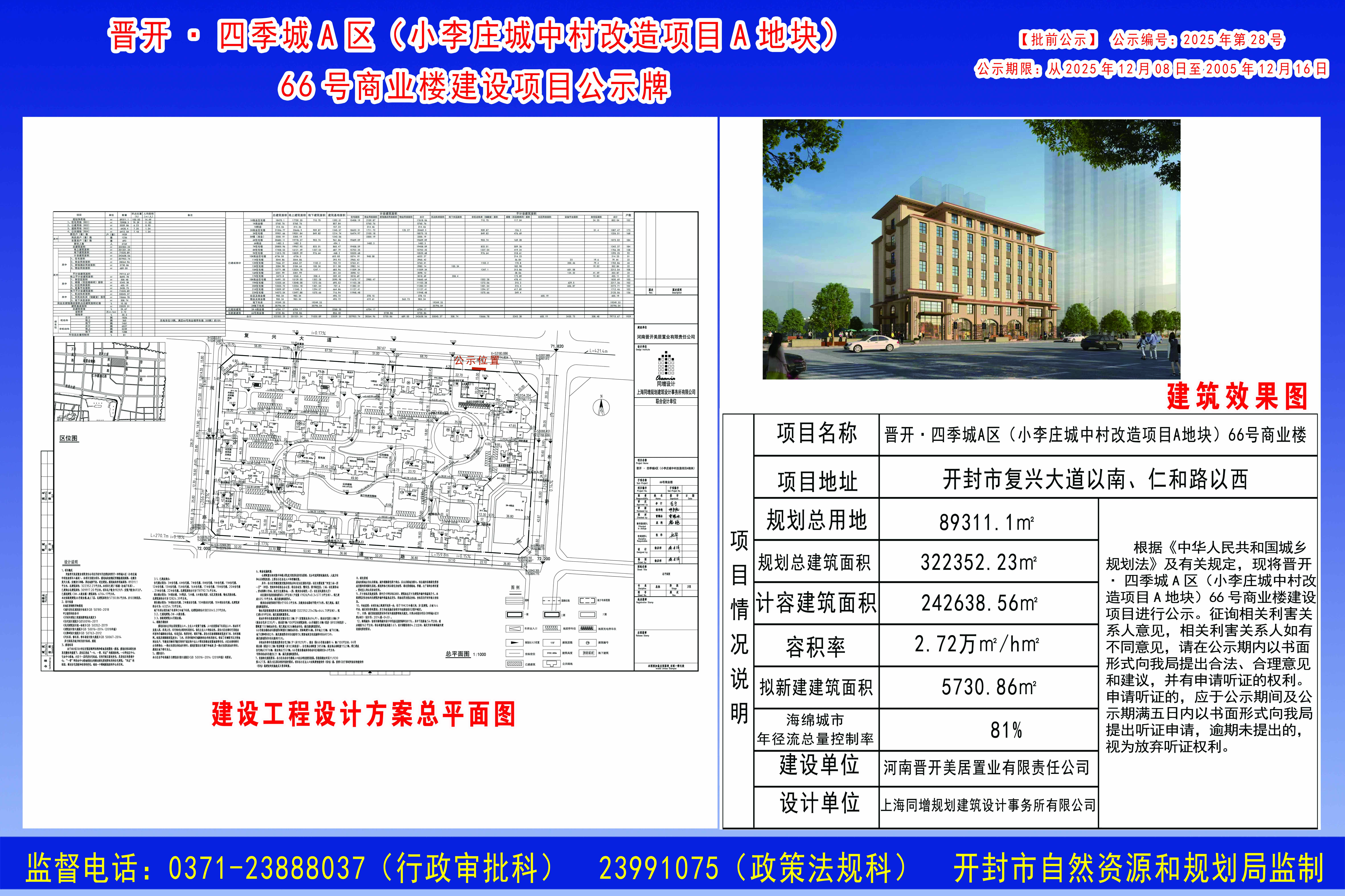 晋开·四季城A区(小李庄城中村改造项目A地块)66号商业楼建设项目公示牌