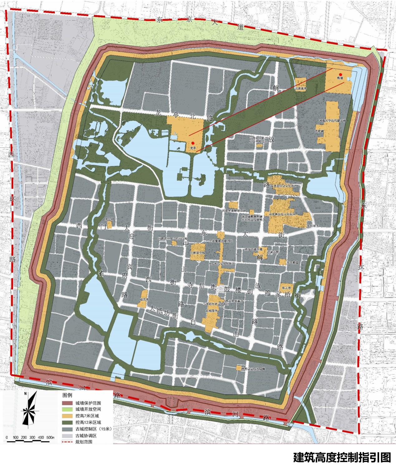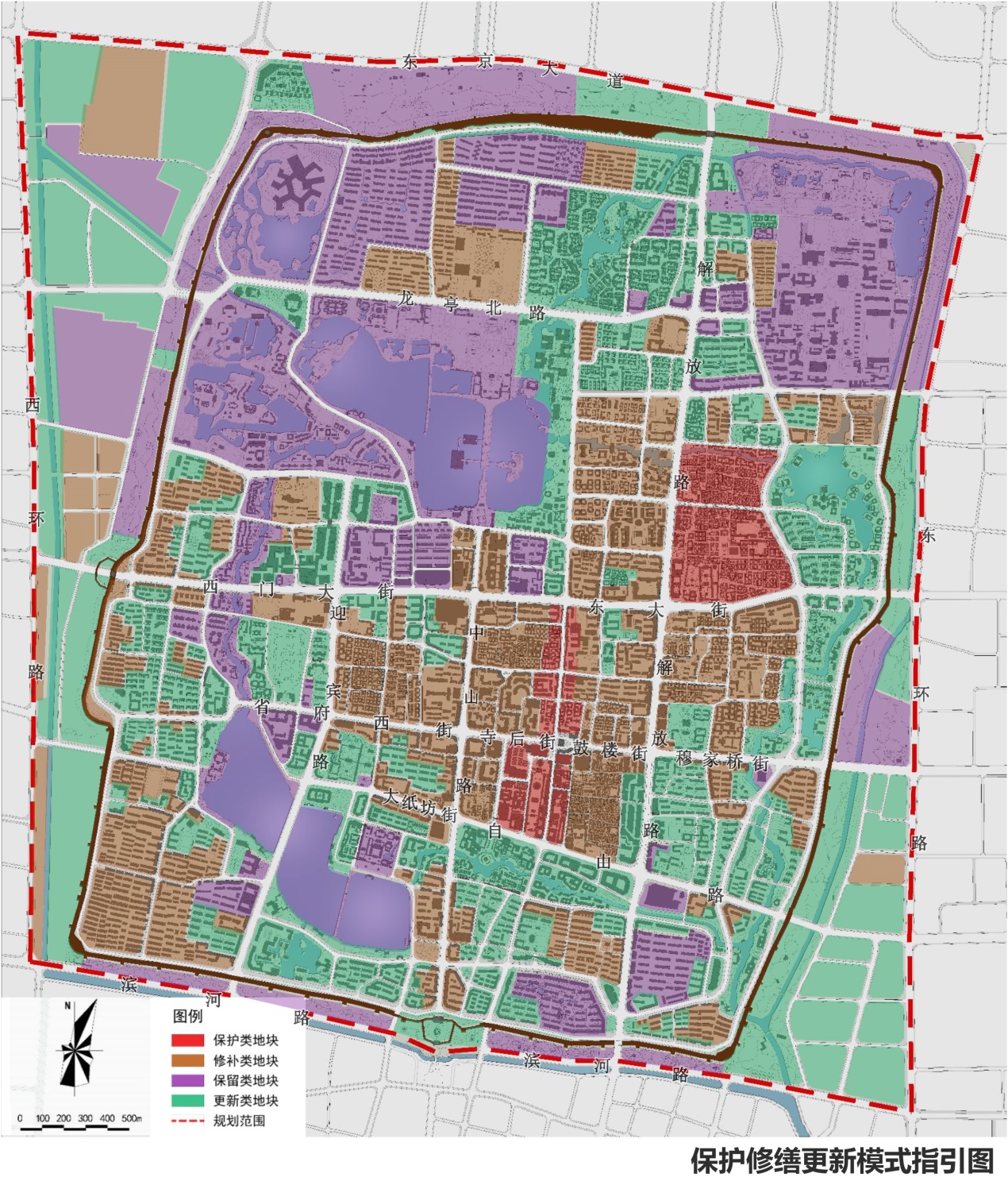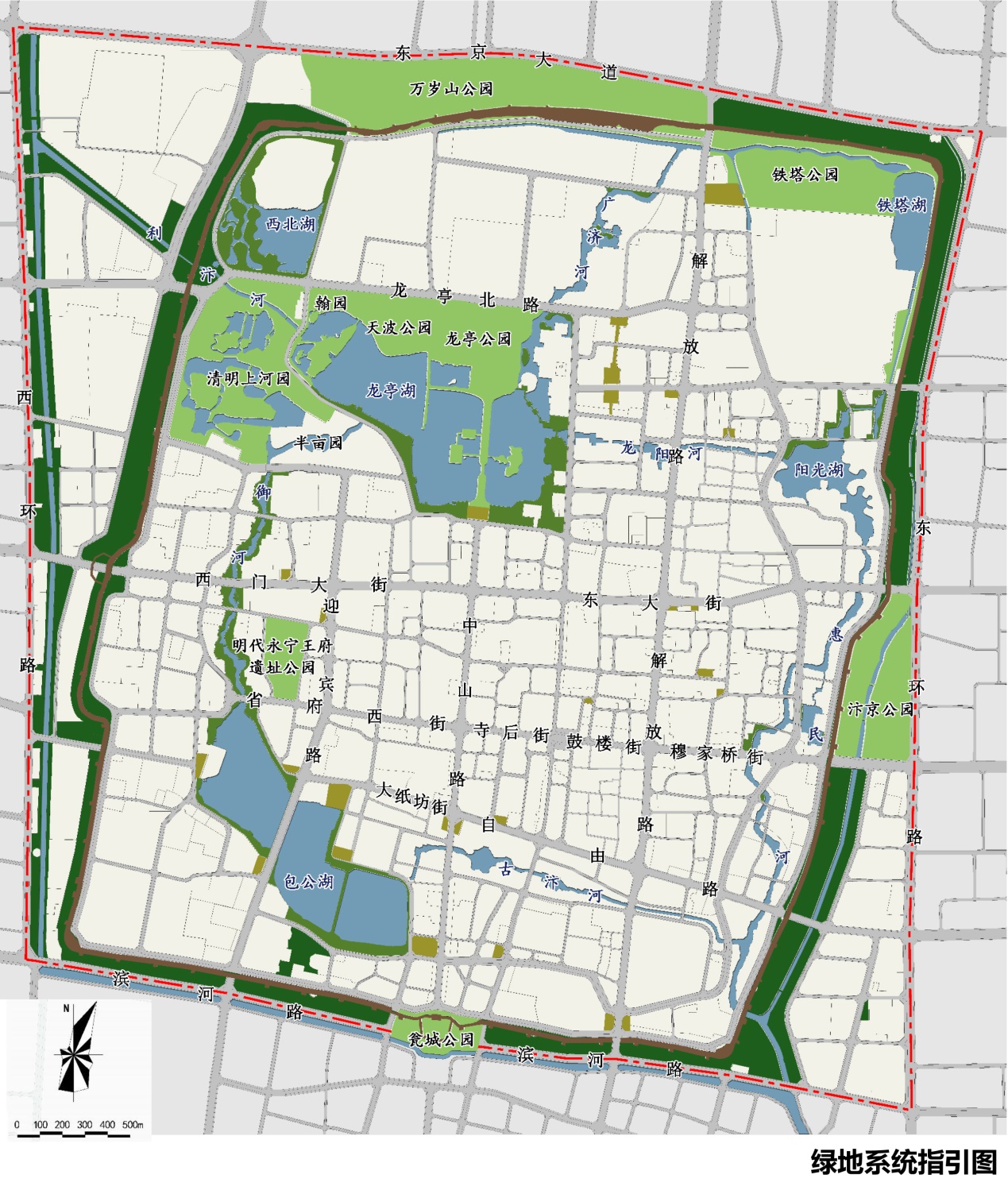 4.生态修复,水城共融。一是全面恢复贯通城内外五湖十河水系,修复河湖水系蓝环。二是实现古城墙、护城河、绿化带、内外顺城路的环城五贯通,修复环城绿环。三是结合文物古迹、自然环境及人文景区,完善古城绿地系统,建设绿廊慢行体系。