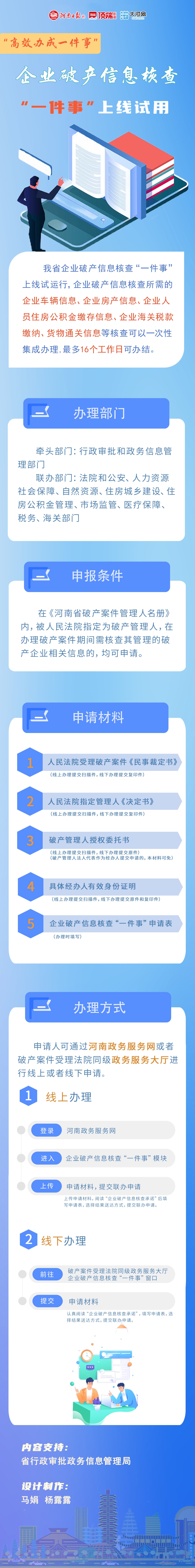 大河网讯 企业破产信息核查是企业进入法定破产程序后必不可少的工作环节。以往办理企业破产信息核查业务,需要破产管理人往返多个部门分头查询,办事程序复杂。企业破产信息核查“一件事”服务上线后,在统一申请材料的基础上,可支撑破产管理人通过线上或线下两种方式一次性申请多个部门的信息核查服务,有效化解办事程序复杂的难题。