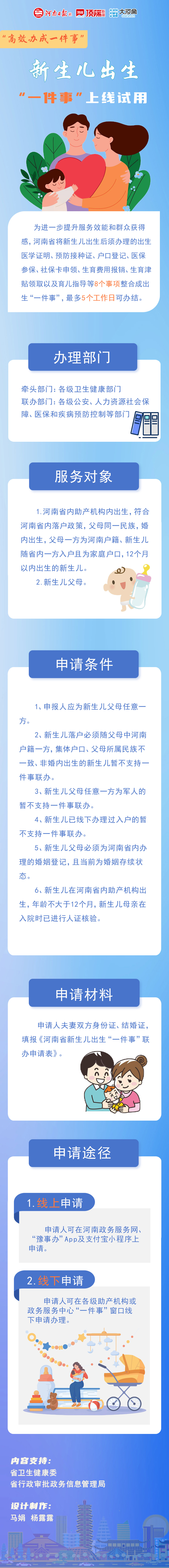 新生儿父母凭夫妻双方身份证、结婚证,可在各级助产机构或政务服务中心“一件事”窗口,或者河南政务服务网、“豫事办”App及支付宝小程序,填报《河南省新生儿出生“一件事”联办申请表》,申请办理新生儿出生“一件事”服务。
